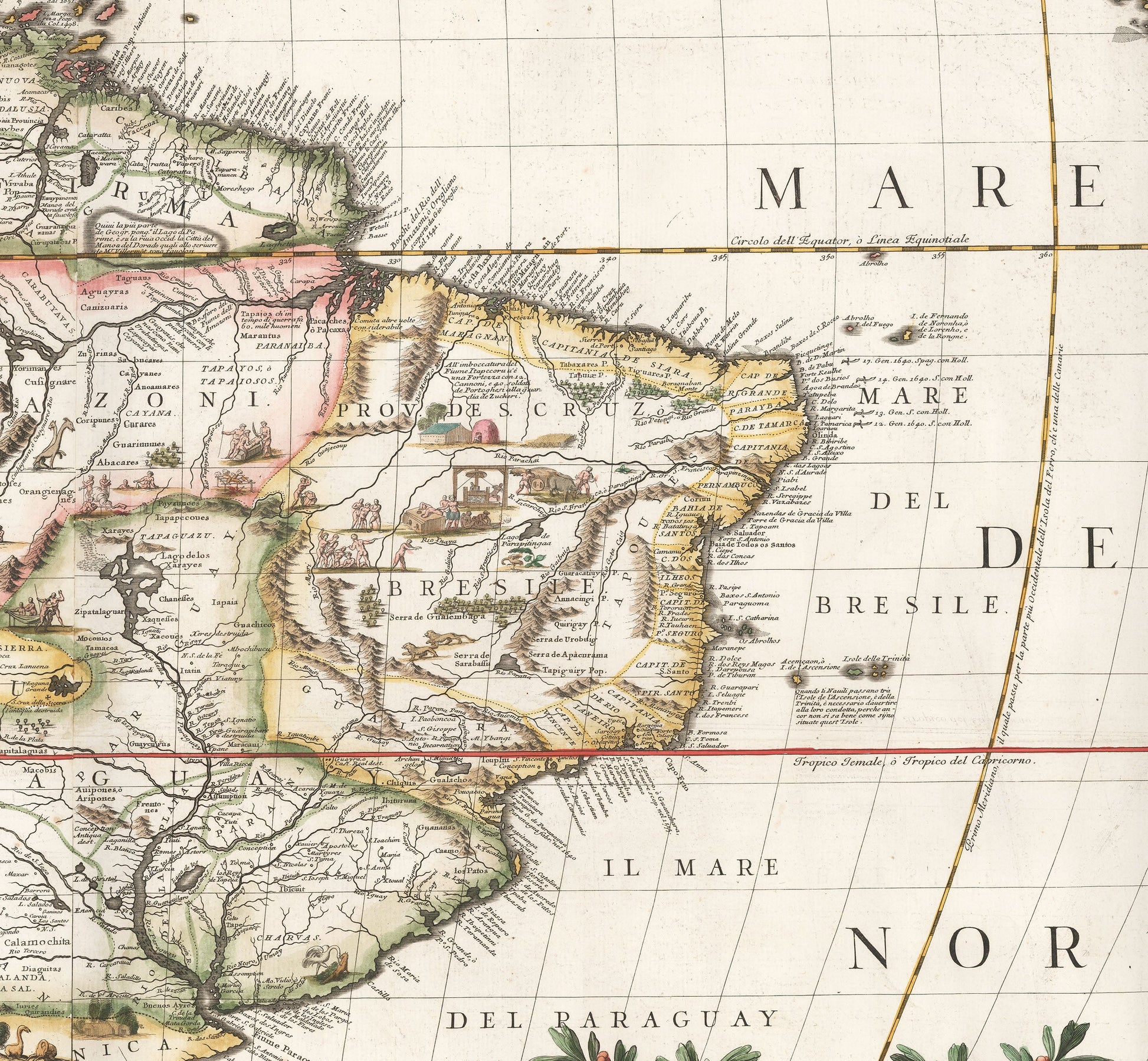 The map illustrates many of the ideas of the New World which were circulating in Europe at the time and is obviously designed to influence its readers, especially in the propagation of widespread cannibalism, scenes of which fill most empty spaces within the Amazon rainforest.?The animals that fill the map are also?appear?as blend of real and imaginary. For instance, while we find Llamas, lizards, leopards, and?Rheas (a large flightless bird), the map also offers the notion of Elephants in Peru and African Lions in the Amazon.?