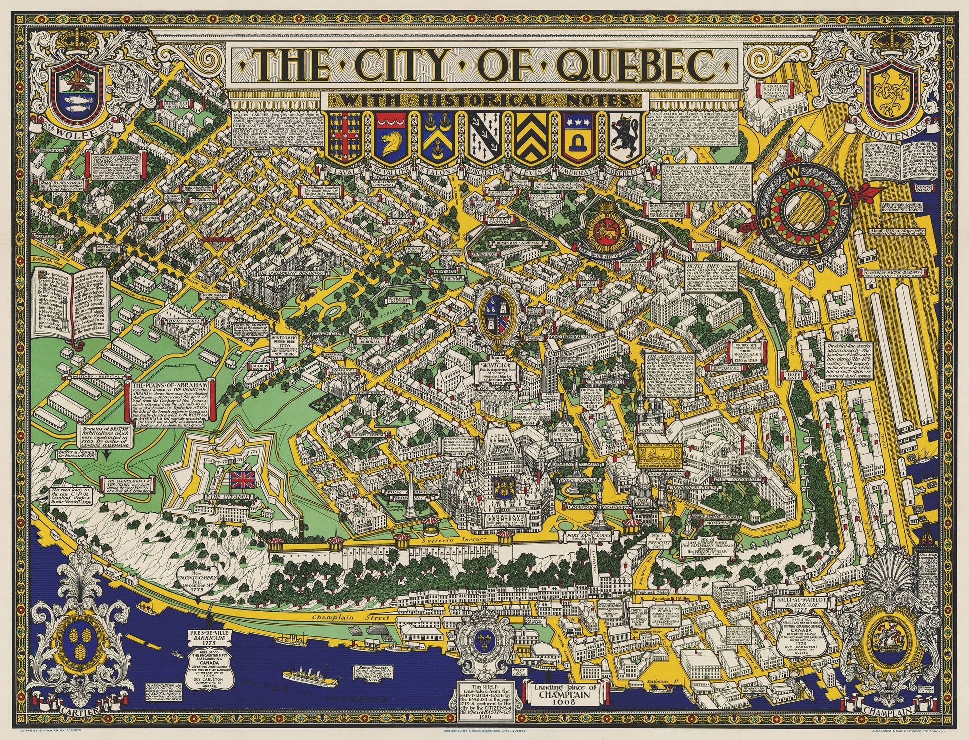 A portion of the top border of the map just under the title is embellished with a series of elaborate coats of arms belonging to prominent families who made important contributions to the city. The four corners are emblazoned with the magnificent crests of Champlain, Cartier, Wolfe and Frontenac. Maw also included numerous notes of historic interest including descriptions of events, notable people, even noting sites of buildings which no longer exist.