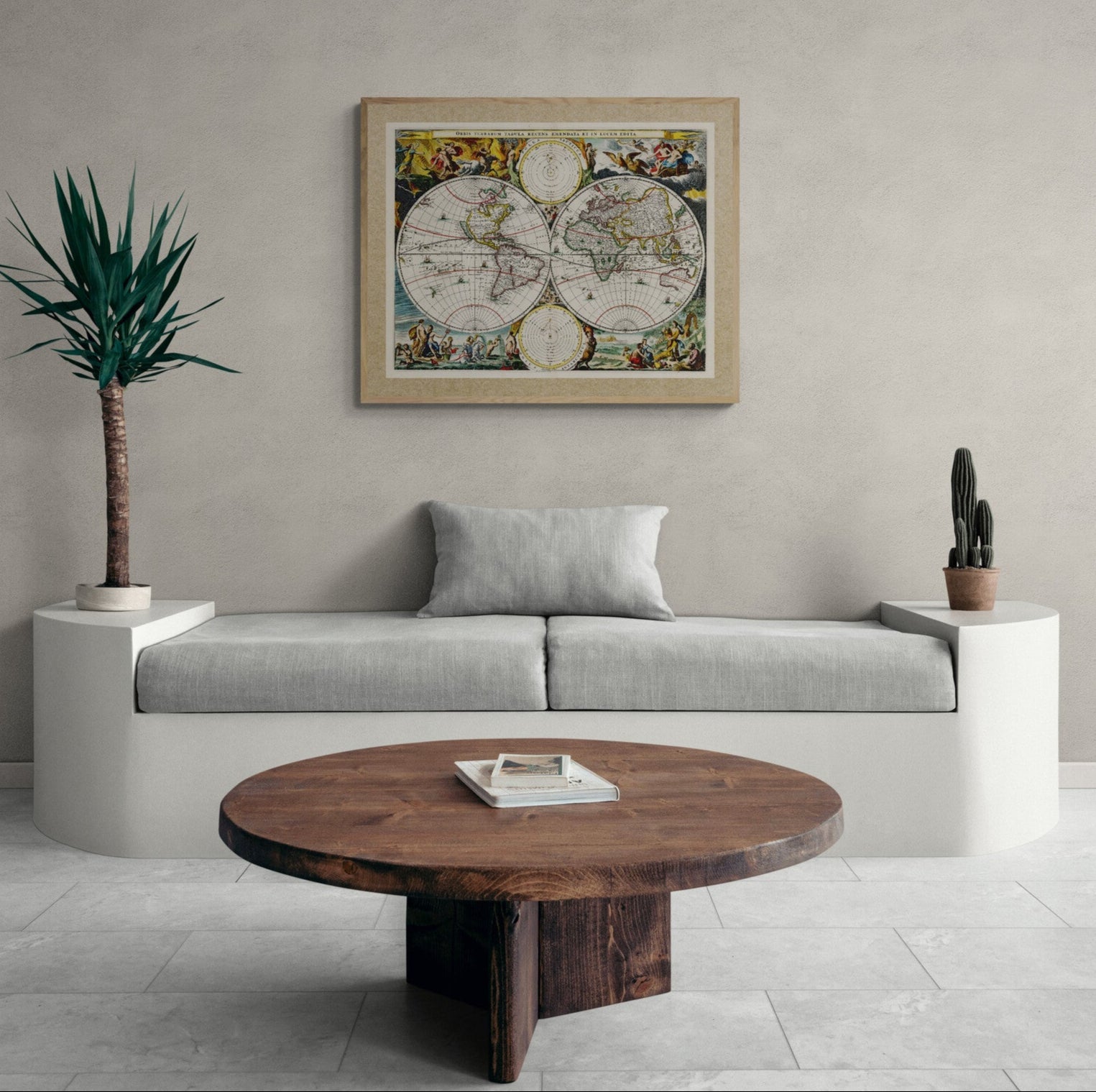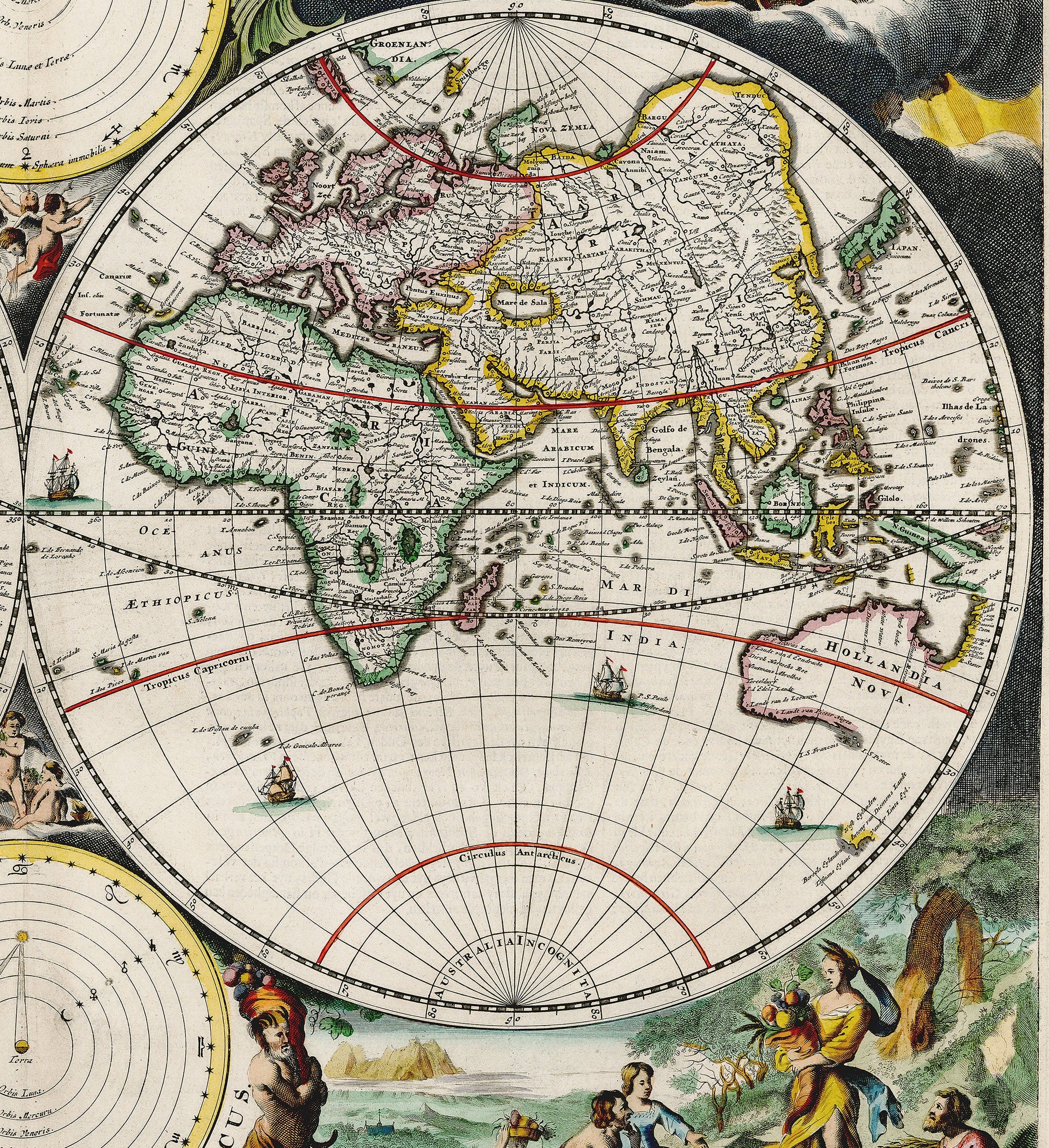 A fine print reproduction of this famous world map, published by the Keur family of the Dutch port city of Dordecht, who were renowned for their beautiful bibles. This striking double hemisphere world map featuring California as an Island is based on an earlier map by Visscher, and decorated much in the style of Visscher.