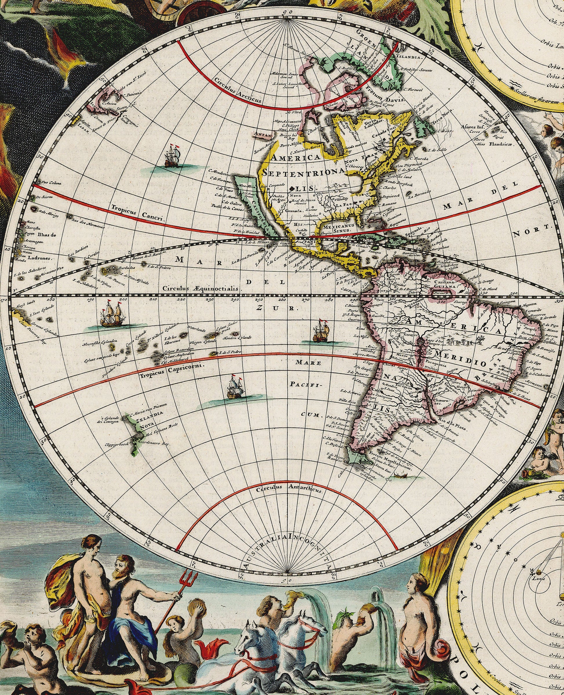 Each corner is adorned with a scene from classical antiquity including the rape of Persephone by Hades in the upper left, and Zeus being carried across the heavens in an eagle-drawn chariot in the upper right. The lower left features a splendid vignette of Poseidon commanding his entourage, and in the lower right Demeter receives the fruits of the Earth. Cherubim fill space between the hemispheres. Astronomical diagrams at top and bottom center represent the north and south poles.