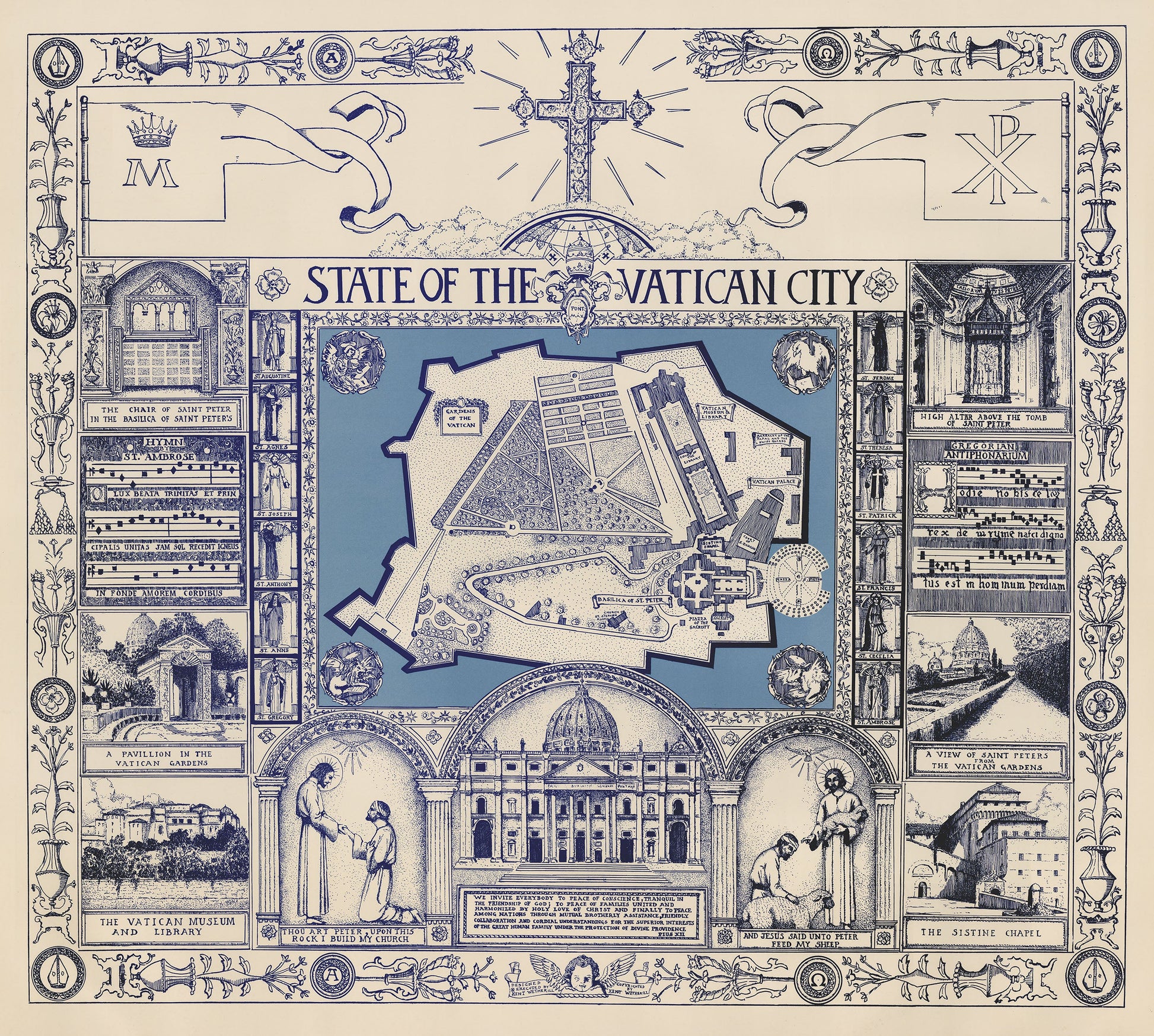 Surrounding the central map are richly detailed religious vignettes that depict sacred spaces and key moments in Christian tradition. At the top, a large crucifix with radiating lines symbolizes the universal reach of the Church, accompanied by banners featuring a Marian emblem and the Chi Rho, an early Christogram. Along the sides, ornate panels showcase important Vatican sites, including the High Altar above St. Peter¡¯s tomb and a listing of popes buried within the basilica.