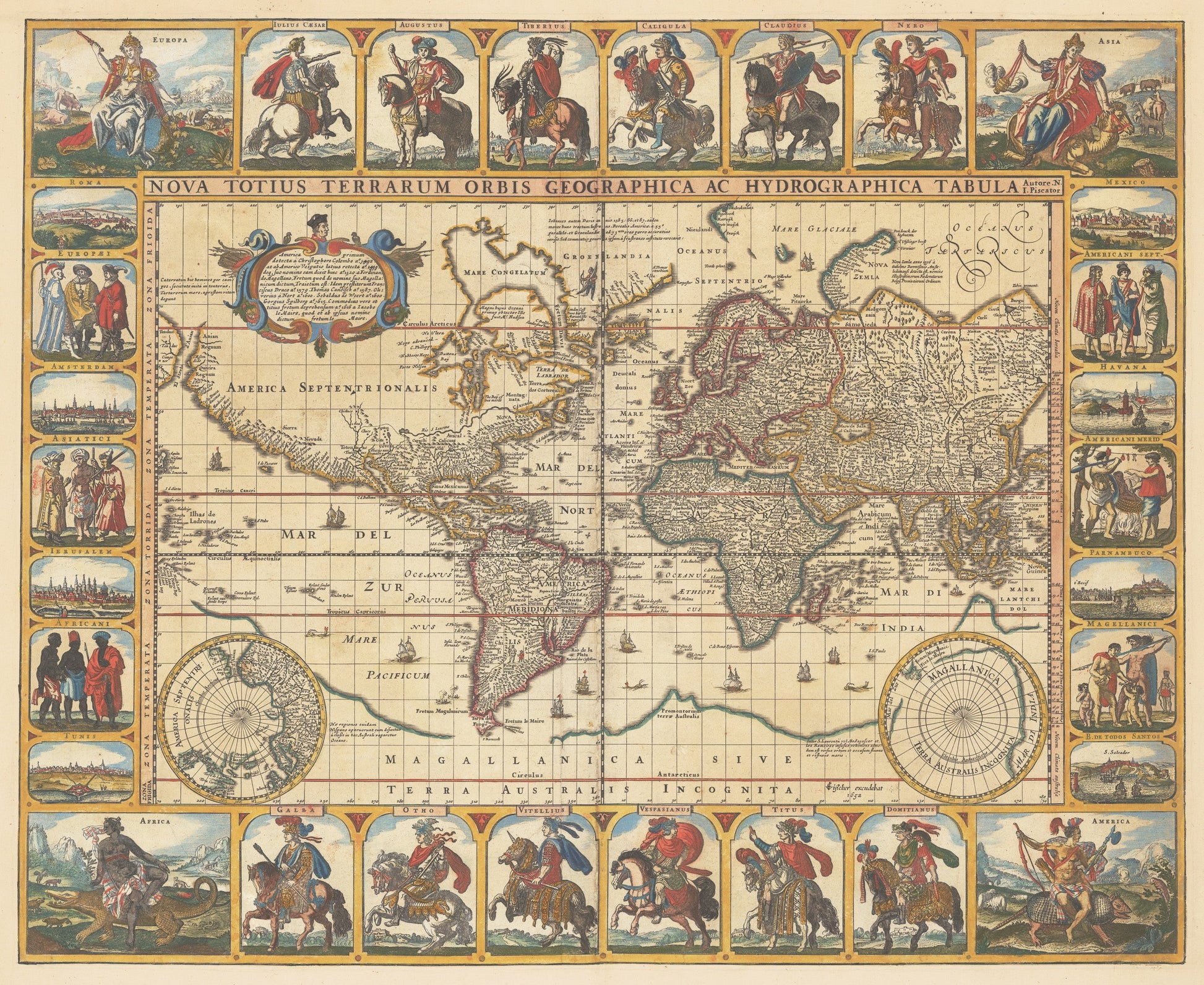 What¡¯s arguably most eye appealing about this map is the decorative border that surrounds it. Twelve Roman emperors are honored above and below the map from Julius Caesar to Domitianus. Flanking the map are 14 panels showing city views and various natives from the far reaches of the world. Finally, at each corner are allegorical figures representing the four continents of Europe, Asia, Africa, and America.
