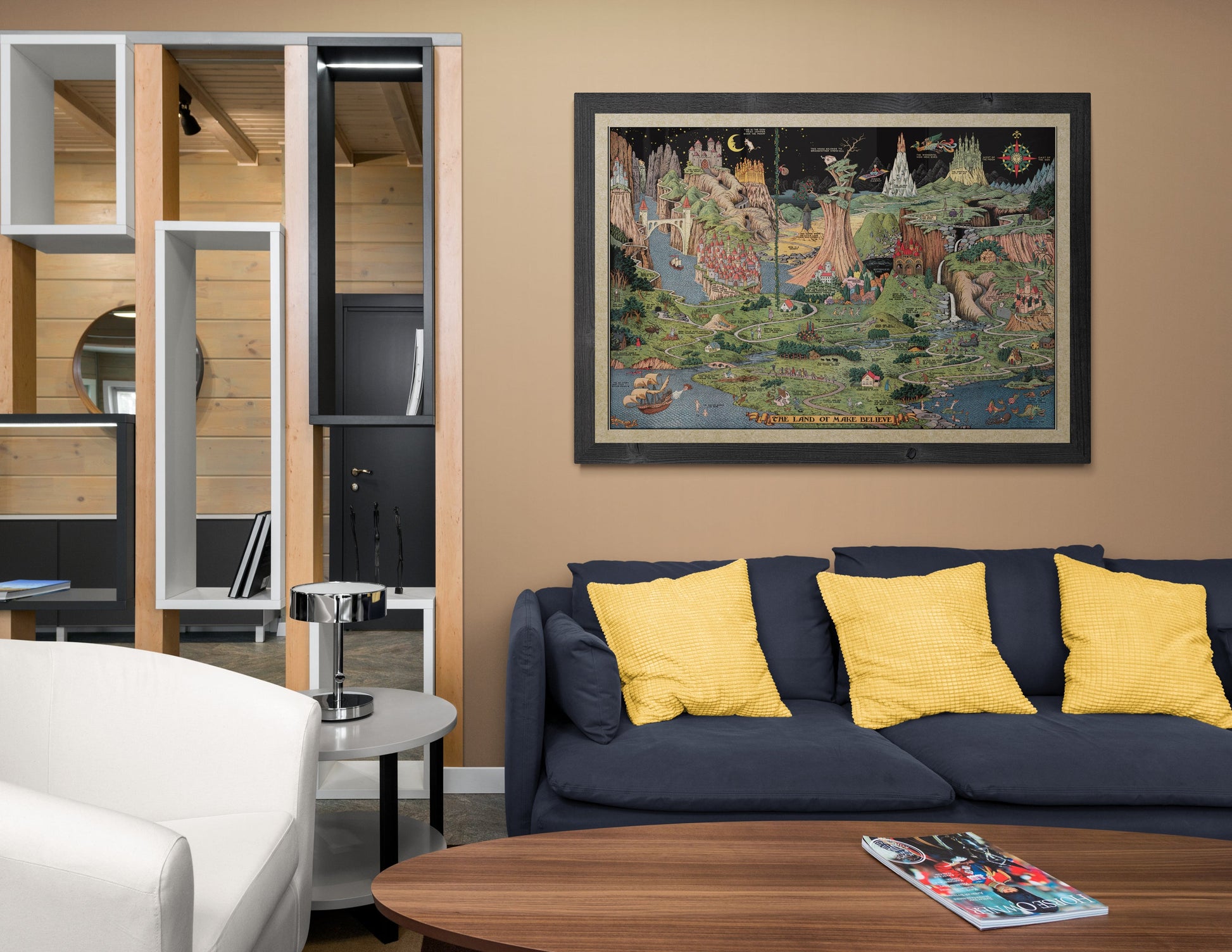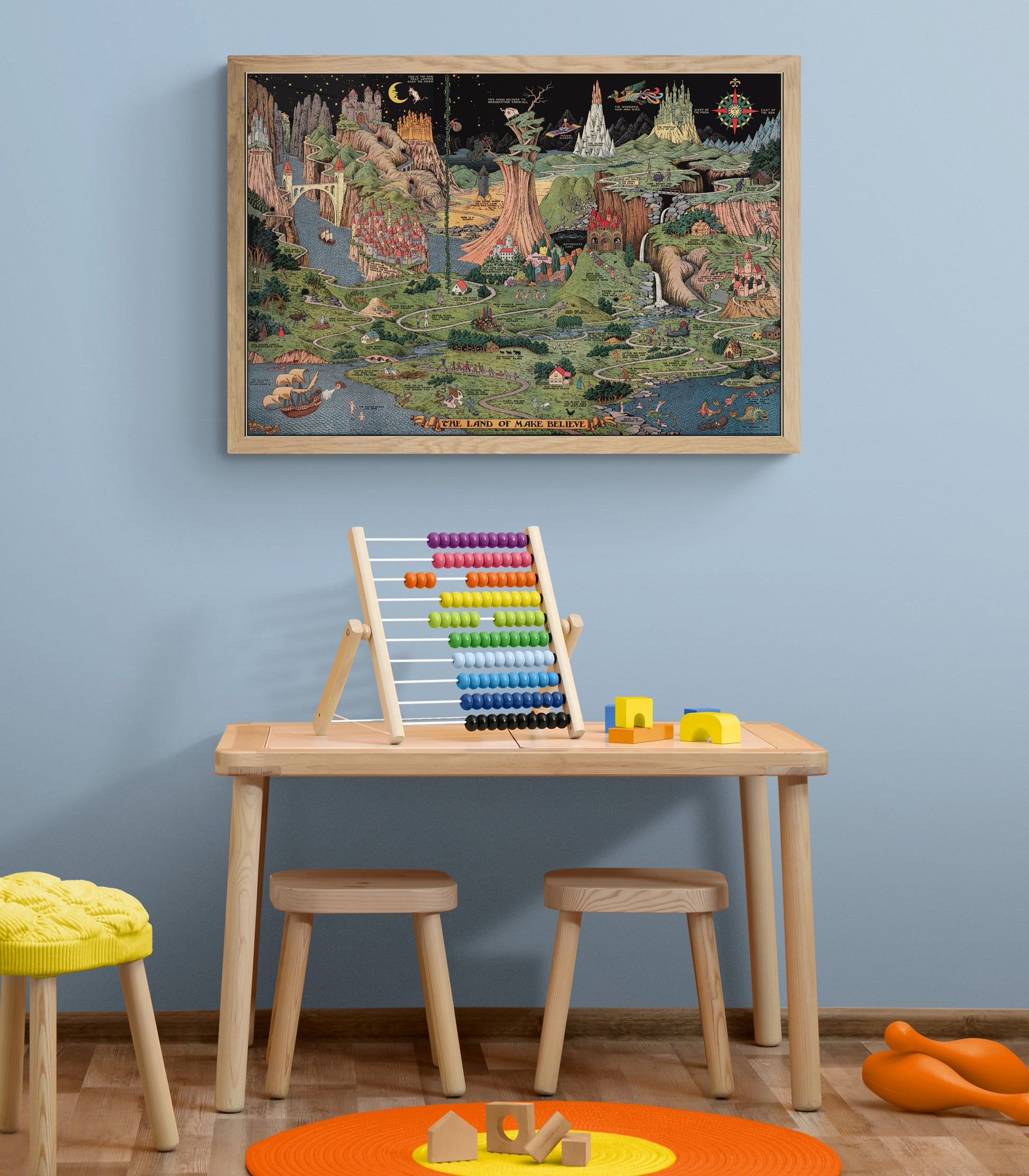 This is a reproduction of a most imaginative and wonderful original map by Jaro Hess. His work depicts a marvelous wonderland including castles, and fictional characters from many cultures, as well as very own imagination.?