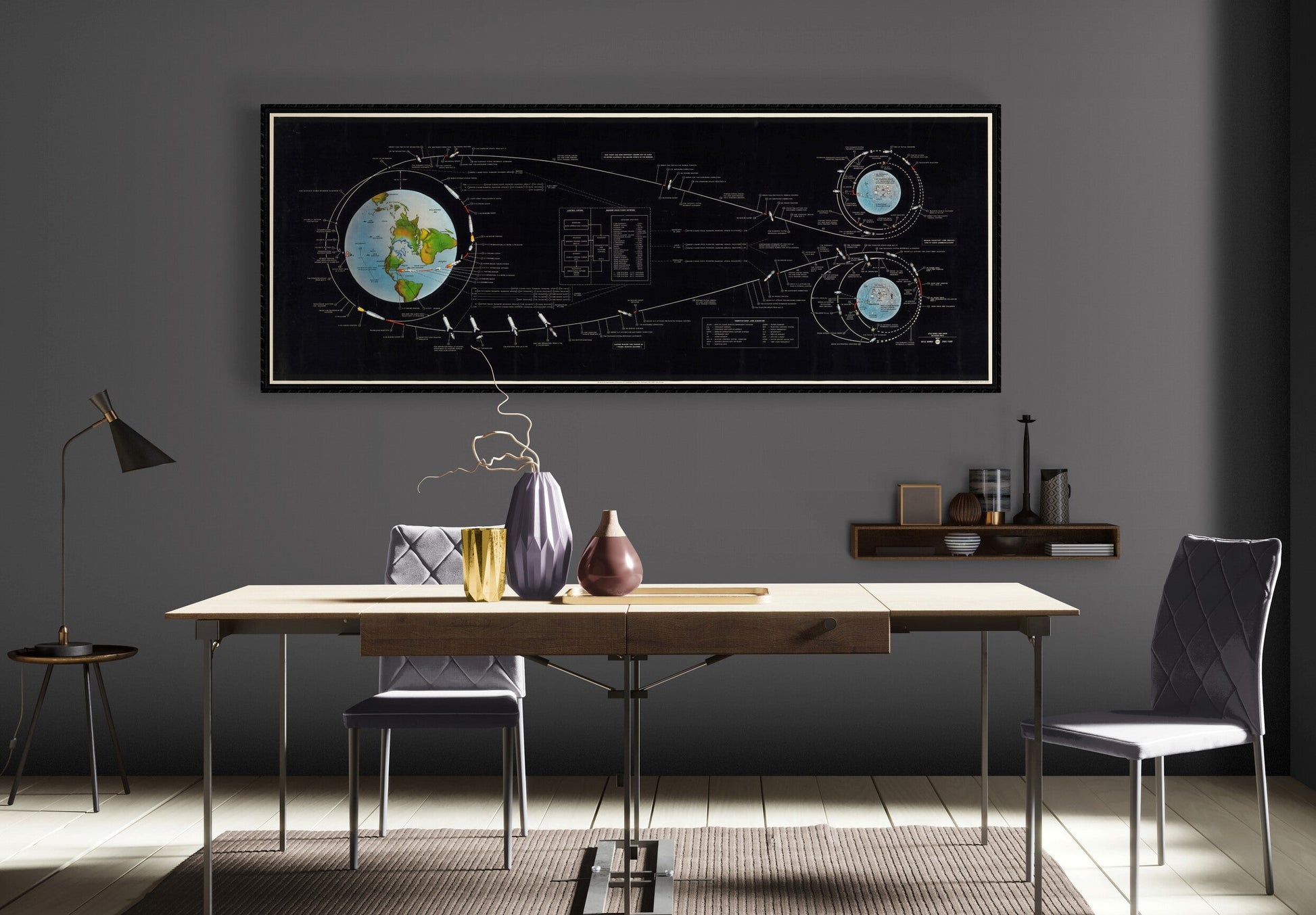 This is an exceptional map for anyone with an interest in space travel, the Apollo 11 moon landing of 1969, or a taste for eye-catching wall decor as this map would be a center piece for any room in which it is hung. It is pleasing from a distance yet invites you in for further inspection.