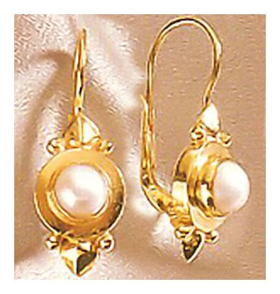 A gift from the sea, these iridescent cultured pearls are mounted in a stylized shield setting of 24k gold over sterling silver. Roman design, with European backs for pierced ears. Size: 1 Inch.