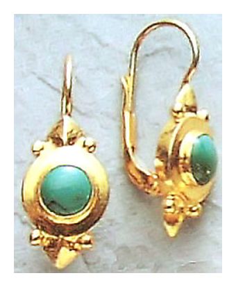 As turquoise as the seas washing Italia's shores, these stones are mounted in a stylized shield setting of 24k gold over sterling silver. Roman design. European backs for pierced ears. Size: 1 Inch.