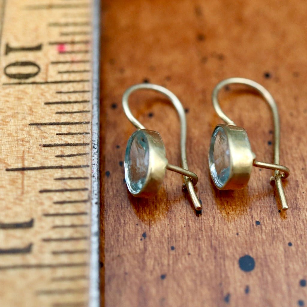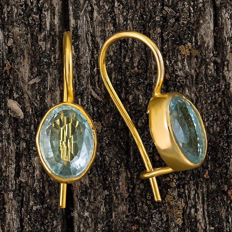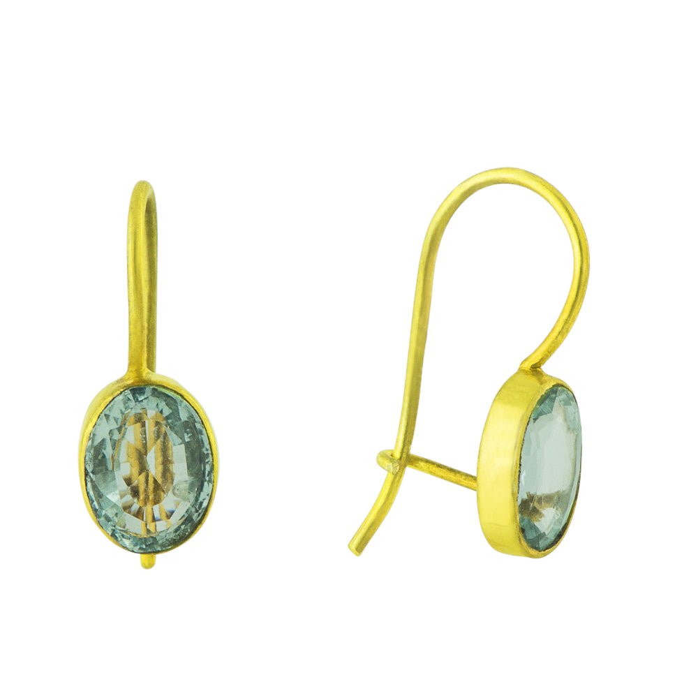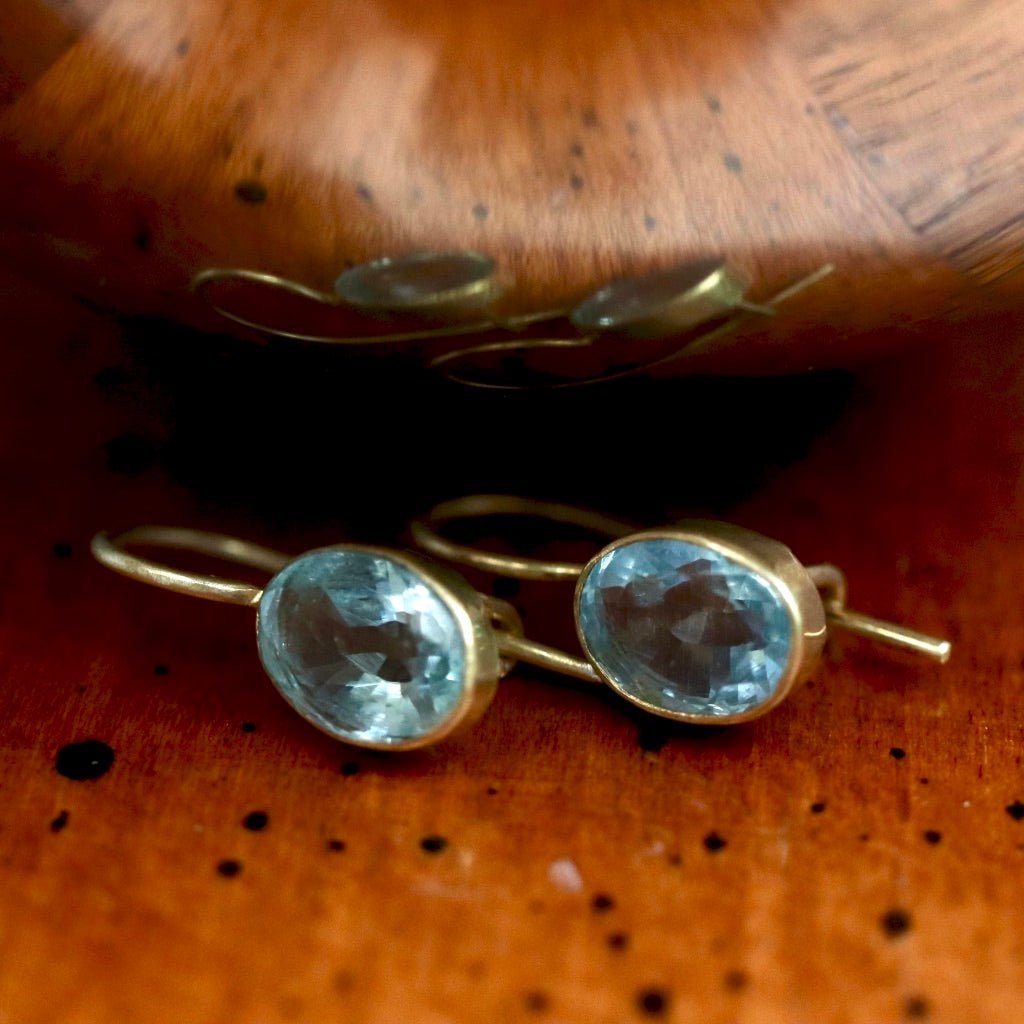 If the ocean could be captured into a gemstone it would choose aquamarine. Here a classic greek setting is decorated with a neoclassic faceted cut. Aquamarine, the delightfully blue beryl stone and close cousin to the emerald, is showcased.