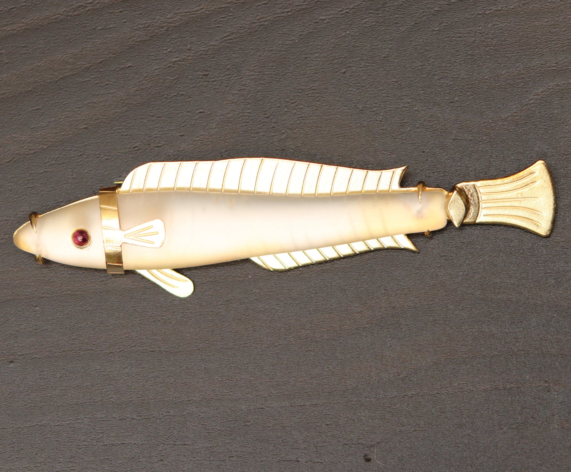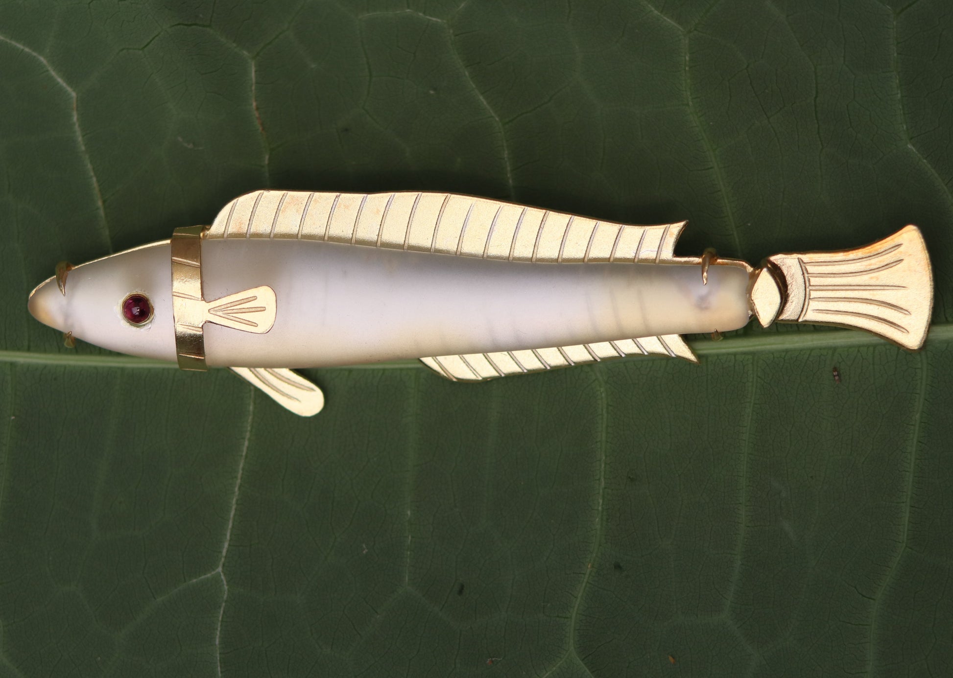 You will never get tired of this fish even after wearing it hundreds of time.? Created with just the right combination of simplicity and elegance. Translucent as light on water, this finny fellow is hand crafted of frosted crystal. 24k gold over sterling silver setting.
