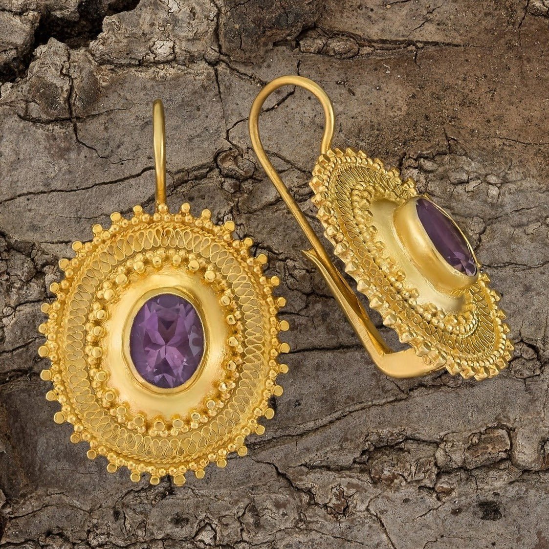 The earrings has unforgettable dignity and grace. An oval variation on a classic Afghani design. Faceted amethyst set in European lever-backs for pierced ears. 24k gold over sterling silver. Size: 1 1/4 inch.