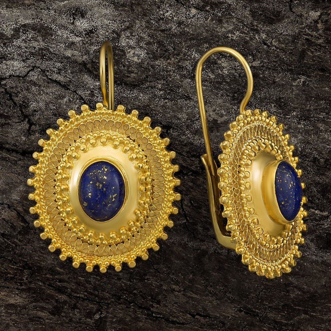 The earrings has unforgettable dignity and grace. An oval variation on the classic Afghani design. Lapis earrings in a traditional cabochon cut. European leverbacks for pierced ears. 24k gold over sterling silver. Size: 1 1/4 inch.