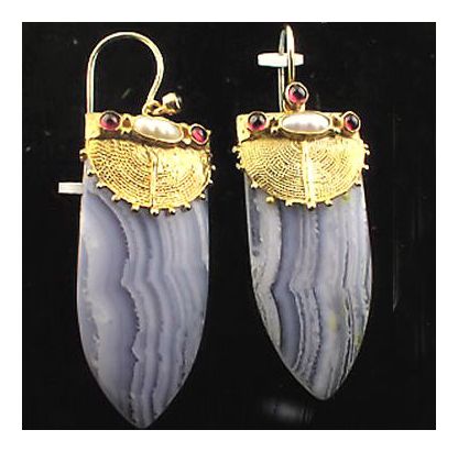 Tribal Elegance: In this African Asante design, a shield of blue lace agate is held in a 24k gold over sterling silver setting with two garnets and a rice pearl. Hoop backs for pierced ears are studded with a single garnet. Size: 2 inches.