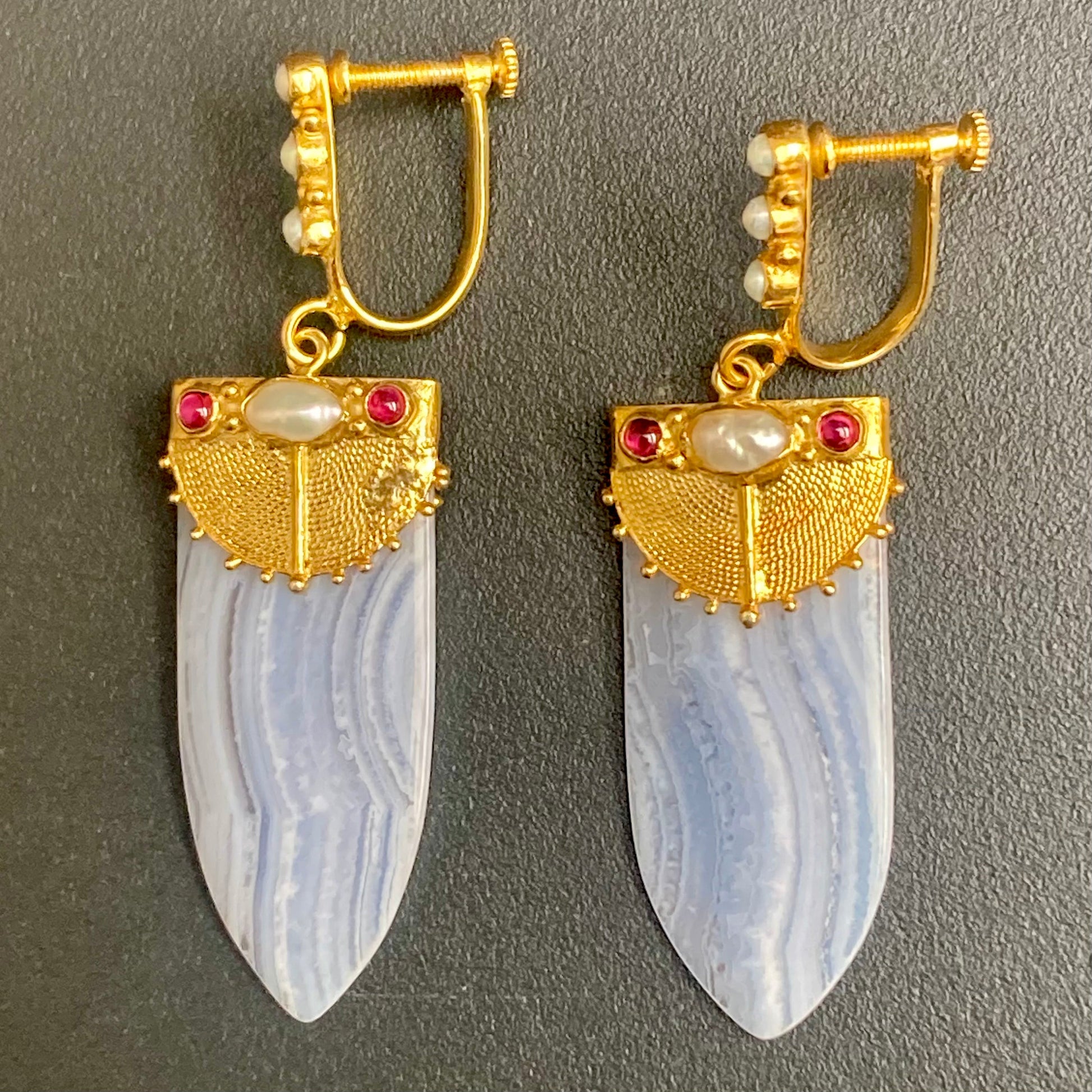 Tribal Elegance: In this African Asante design, a shield of blue lace agate is held in a 24k gold over sterling silver setting with two garnets and a rice pearl. Screw backs for non-pierced ears. Size: 2 inches.