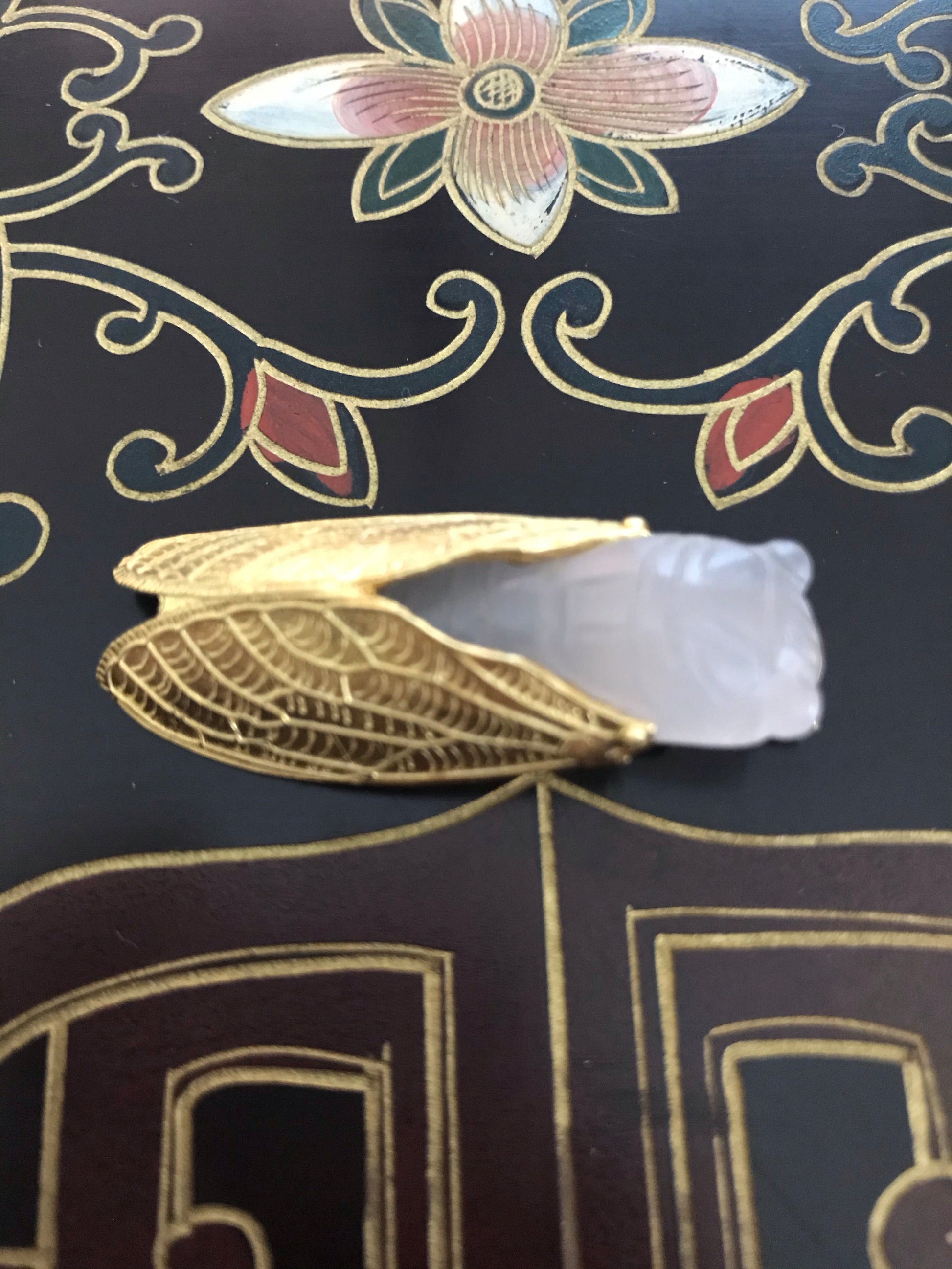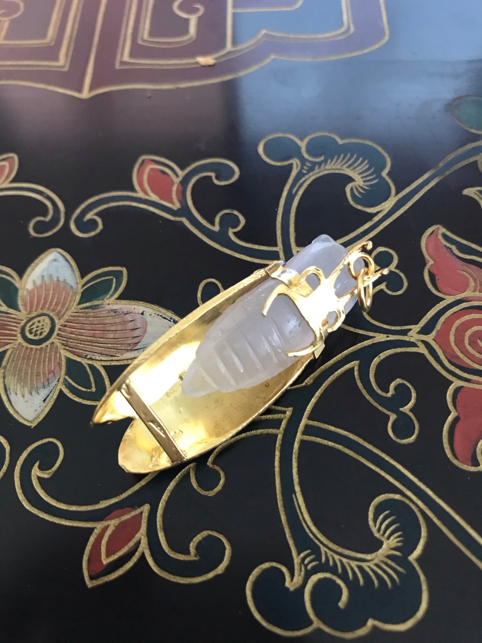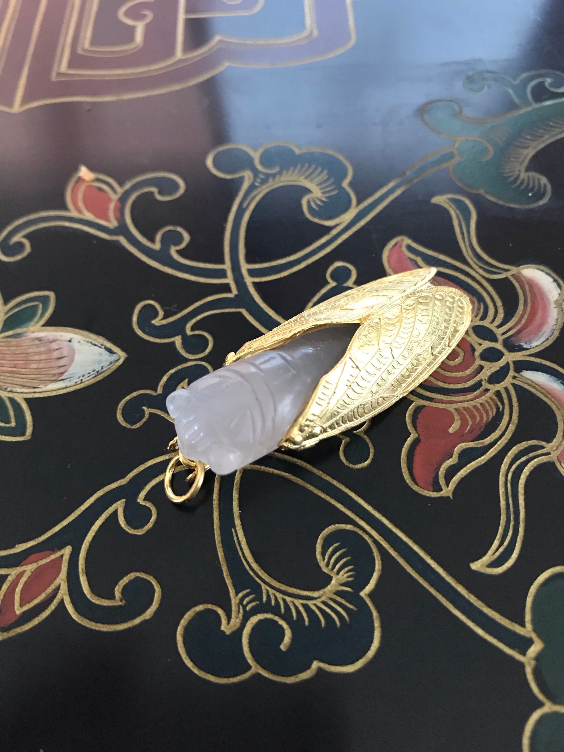 Our summertime songster adds a lighthearted spirit to your day. Hand carved of agate with 24k gold over sterling silver wings. Pendant comes with a 24 hand braided silver chain.