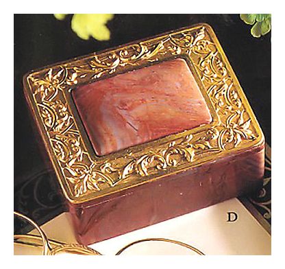 A noble home for your most cherished jewels and trinkets, our agate box boasts an elegant faux gold frame. Hand crafted, it measures 2 7/8 x 2 3/8 x 1 1/8H.