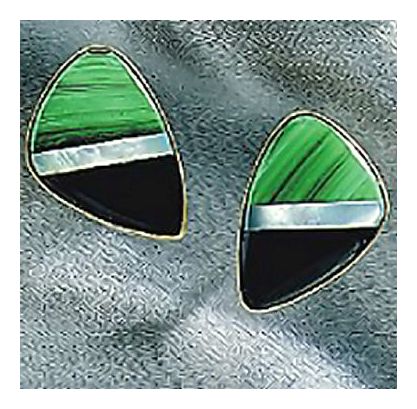 A shield of malachite, onyx, and mother of pearl makes an elegant statement at work or after hours. 24k gold over sterling silver settings, with post backs. Size: 1/2 Inch.