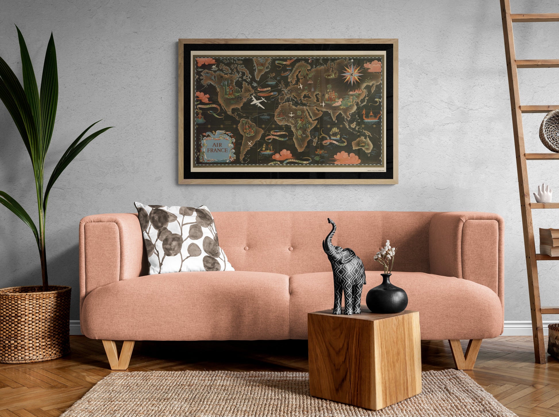This is a fine reproduction of an original Air France world map by Lucien Boucher. The original map was published out of Paris in 1947 as an advertisement poster for the airline.