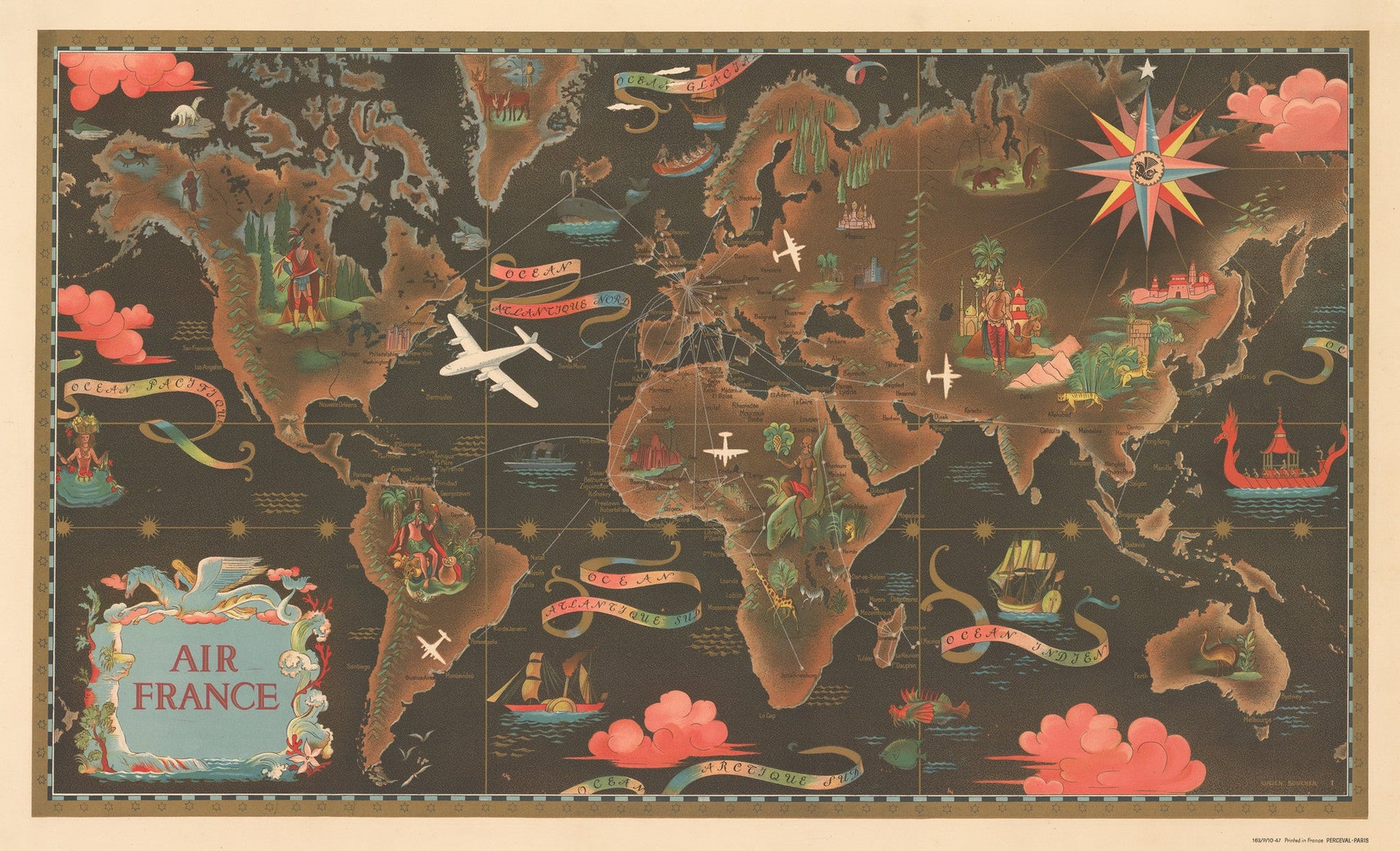 The map maker, Lucien Boucher was a commercial poster artist and illustrator, whose work was very popular at?time this map was originally created. Born in Chatres, in 1899, he eventually graduated from?the Ecole de c¨¦ramiques de S¨¨vres and began working as a satirical cartoonist for newspaper Le Rire. In 1920s, he created a number of movie posters as he began to perfect his surrealist style. Eventally in the 1940s, he was commissioned by Air France to create a series of poster advertisements, including the one imaged above.