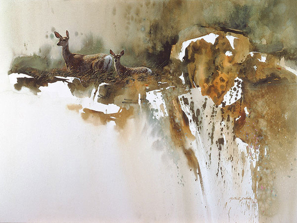 A Doe and her young fawn stand atop a cliff overlooking who knows what. Their ears are alert to any sounds that may threaten them. This is a beautiful scene in between the boulders that surround them. Gorgeous watercolor print.