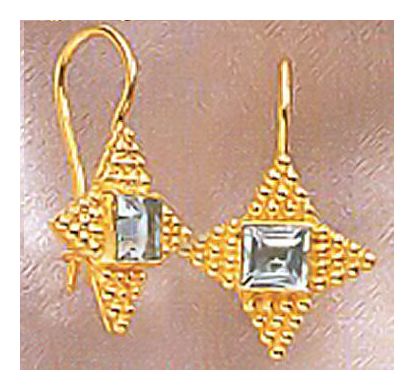 A gleaming granule star is the signature of this Roman design. The handcrafted of 24k gold over sterling silver setting holds an Blue Topaz stone. Hinged backs. Size: 7/8 Inch.