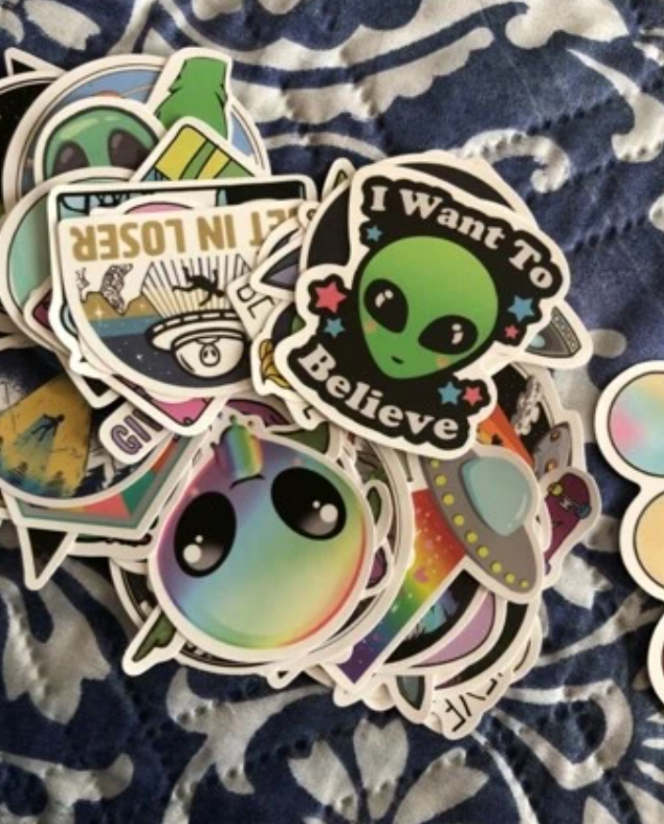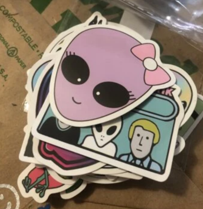Chosen at random we will send you three alien stickers and shipping cost in the United States is included. We will happily ship outside the United States but we will have to charge shipping in other countries.