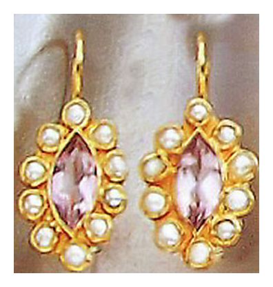 One can't argue with high aesthetics. Dainty earrings such as these were quite proper at tea time in Marlborough. The amethysts are encircled by tiny cultured pearls. 24k gold over sterling silver tassel setting. European backs for pierced ears. Size: 1 inch.