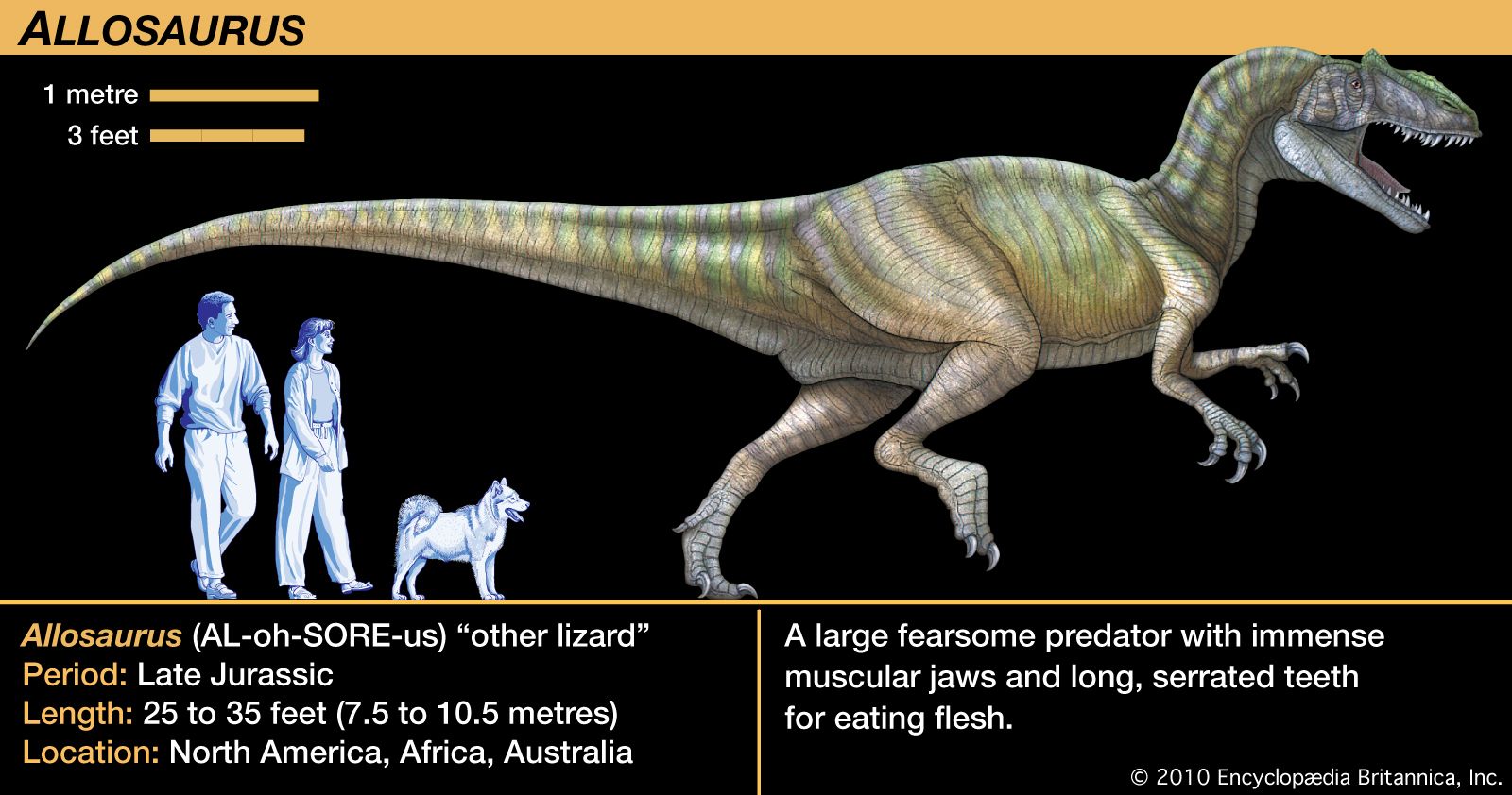 Allosaurus is a genus of large theropod dinosaur that lived in the late Jurassic period (Kimmeridgian to Tithonian). The name Allosaurus means different lizard. The first remains that can definitely be ascribed to this genus were described in 1877 by Othniel Charles Marsh. As one of the first well-known theropod dinosaurs, it has long attracted attention outside of paleontological circles. It has also been a lead dinosaur in several films and documentaries.