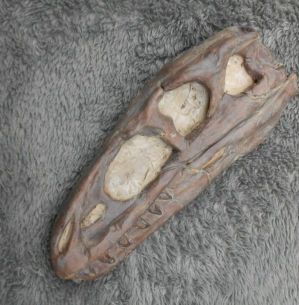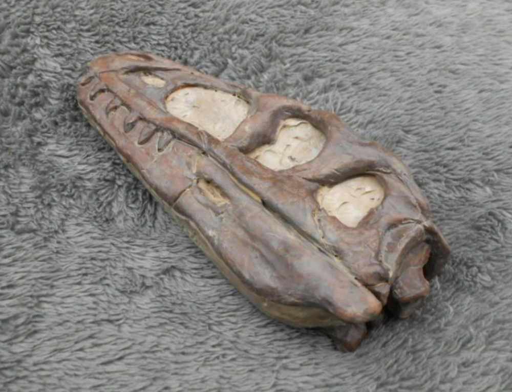 Dilong skull,?a small, feathered tyrannosaur that lived during the Early Cretaceous period.?Dilong was one of the earliest known tyrannosauroids, and it possessed features like a Y-shaped crest on its snout and three fingers on each hand, unlike its later relatives, such as the Tyrannosaurus Rex.?The original fossil, which was found in China.?Dilong is significant in the study of tyrannosaur evolution because it provides insight into how these dinosaurs developed before evolving into the larger, more well-known forms.?